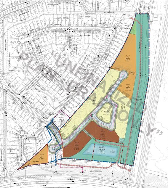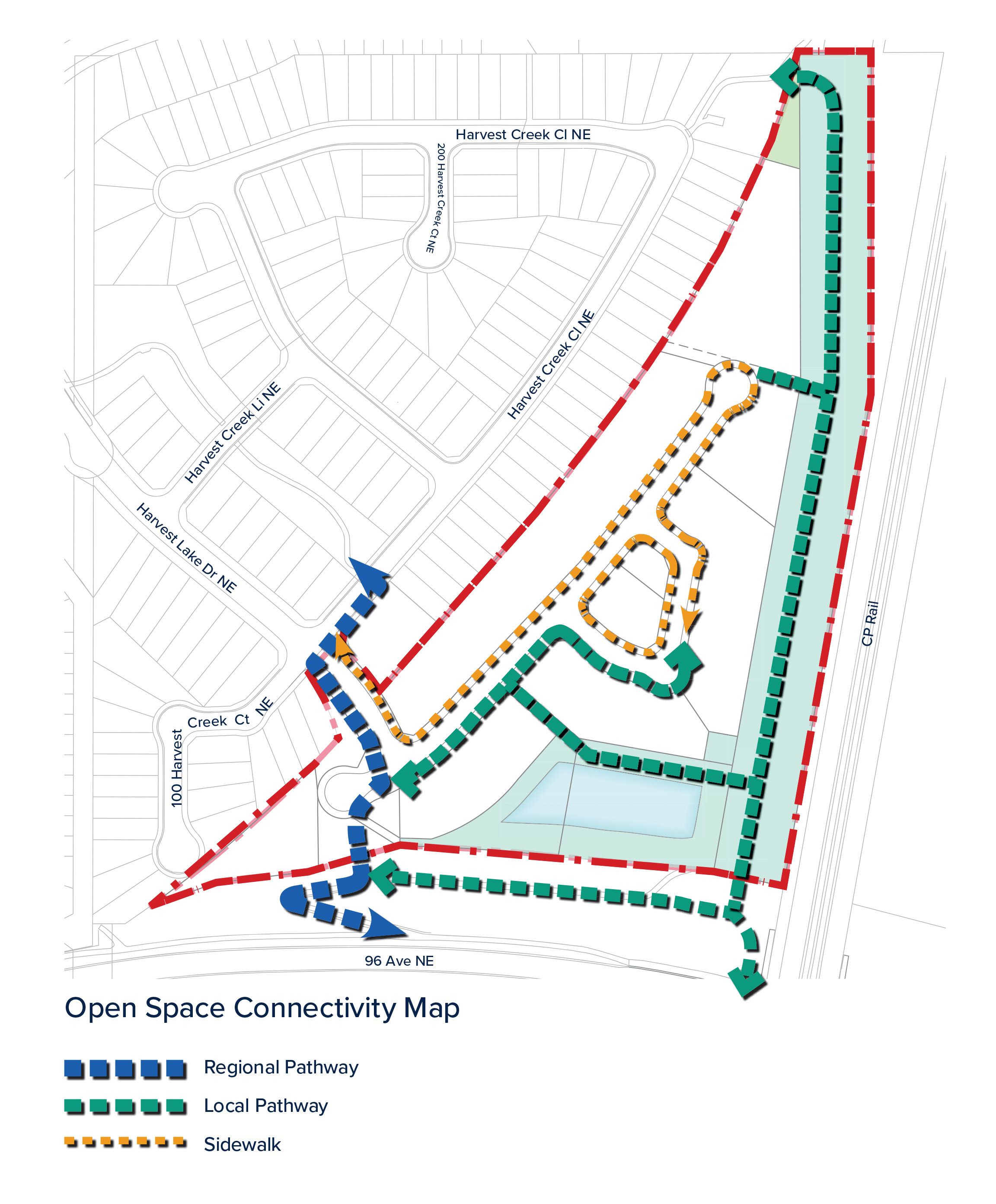 The site is framed by 96 Avenue NE on the south, the Canadian Pacific rail line on the east and residential houses that span along the west side. The site currently has no direct access to a public road right-of-way and the City is working collaboratively with the applicant to find an alternative access solution. This proposal seeks to introduce a new primary access along the existing utility right-of-way that links the site to Harvest Creek Close NE and be a logical extension of Harvest Lake Drive NE. To facilitate this, a small portion of an MR parcel will need to be transitioned to a public road right of way to accommodate the new public entry road. This is a safe, reasonable and necessary access solution to the subject parcel in lieu of the limitations created by the changes made by the City to the previous site access from 96th Avenue.